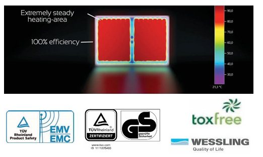 Unser Heizmodul wird zu 100 % in Deutschland produziert - von der Entwicklung bis hin zur Endmontage. Die weltweit einzigartige Technik, bei der im Beschichtungsverfahren die von unserem Hersteller entwickelte Heizpaste zwischen zwei ultradünnen Glasscheiben aufgebracht wird, garantiert eine hohe Energie-Effizienz und Langlebigkeit. Dies bestätigen auch die von renommierten Institutionen durchgeführten Zertifizierungen im Bezug auf Sicherheit, Umwelt und Lebensdauer.
